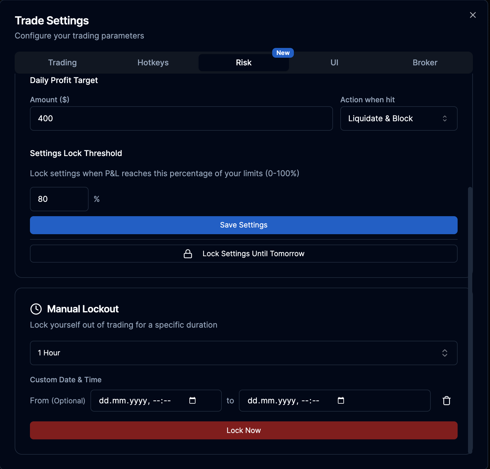Lock yourself out for 15 min, 30 min, 1 hour, until market open, etc., or set a custom time.